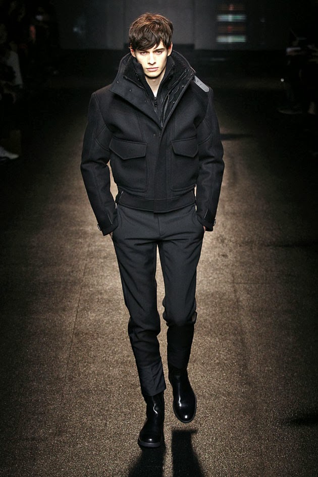 Salvatore Ferragamo trouxe uma coleção com cores bem fechadas para a Semana de Moda Masculina de Milão. Preto, azul marinho, roxo e verde musgo eram as cores presentes em ternos, jaquetas e trench coats com golas altas e modelagem bem pesadas para o outono/inverno 2013/14. Confiram a coleção.