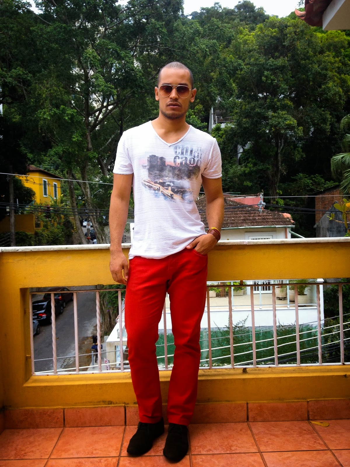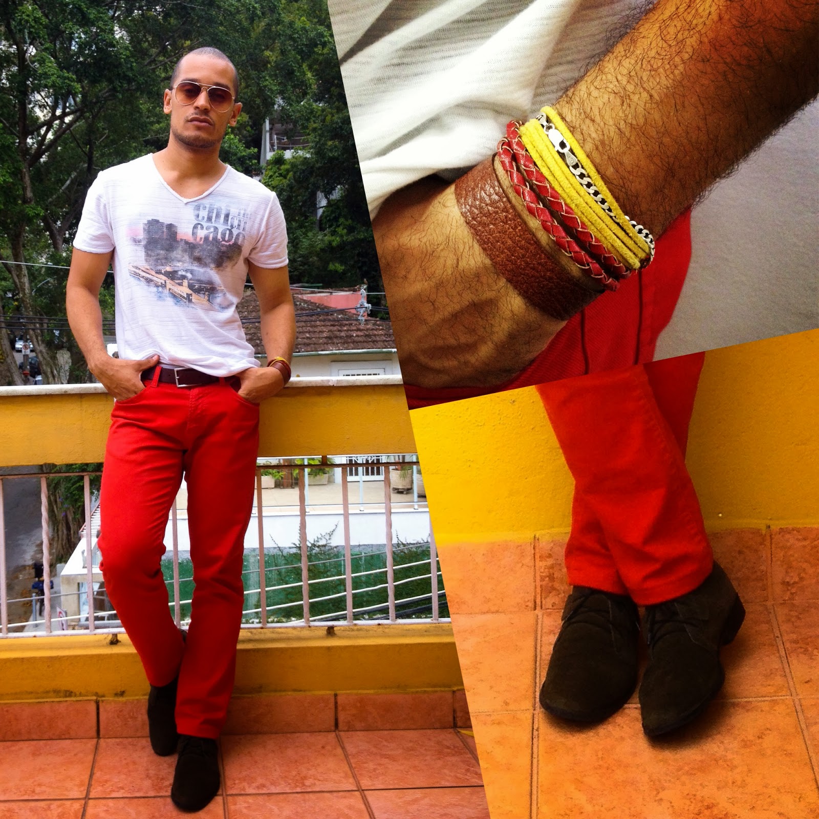 Calça color chino: Zara; T-Shirt: Zara; Desert Boots: Riachuelo; Óculos: Asos; Pulseirismo: acervo.