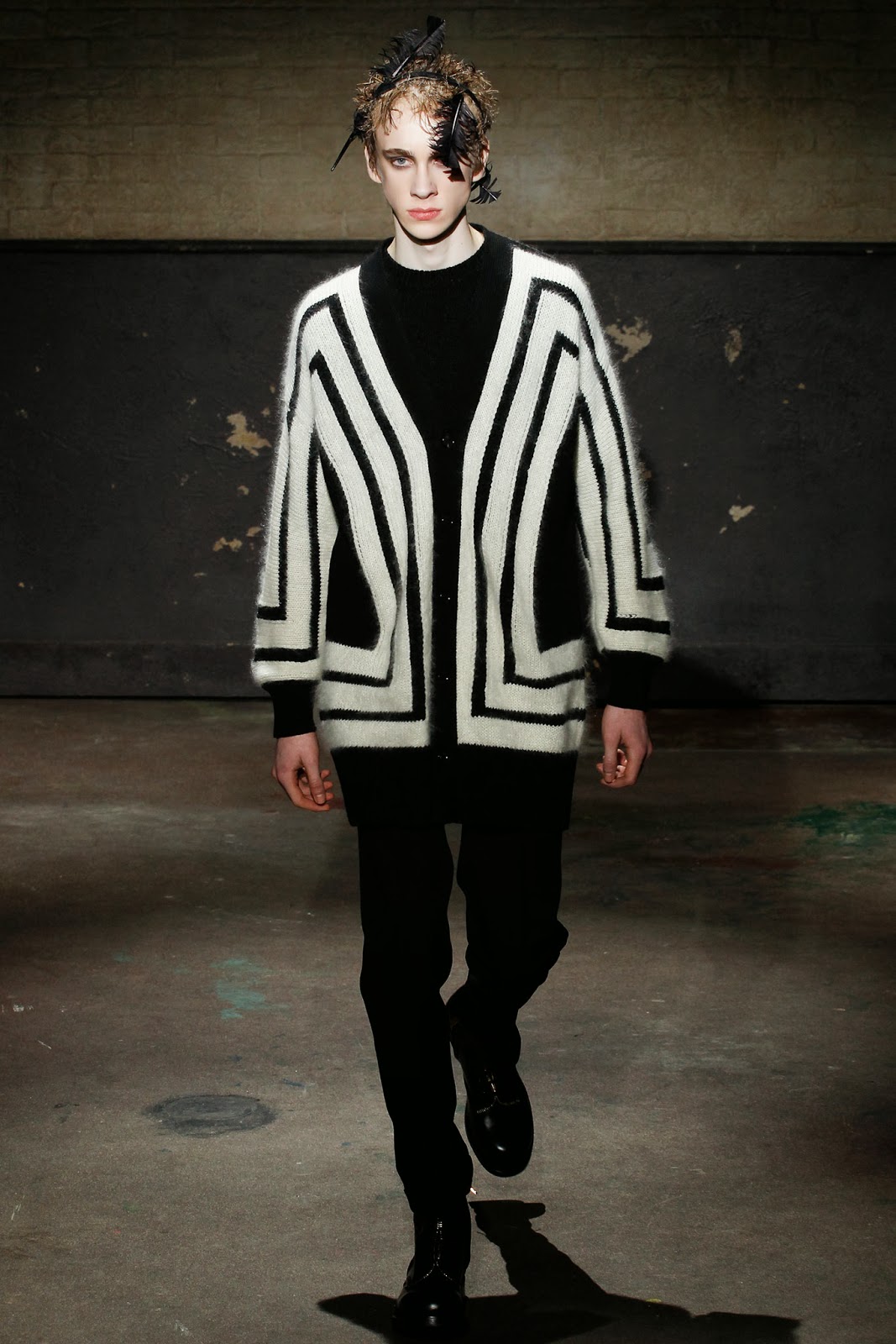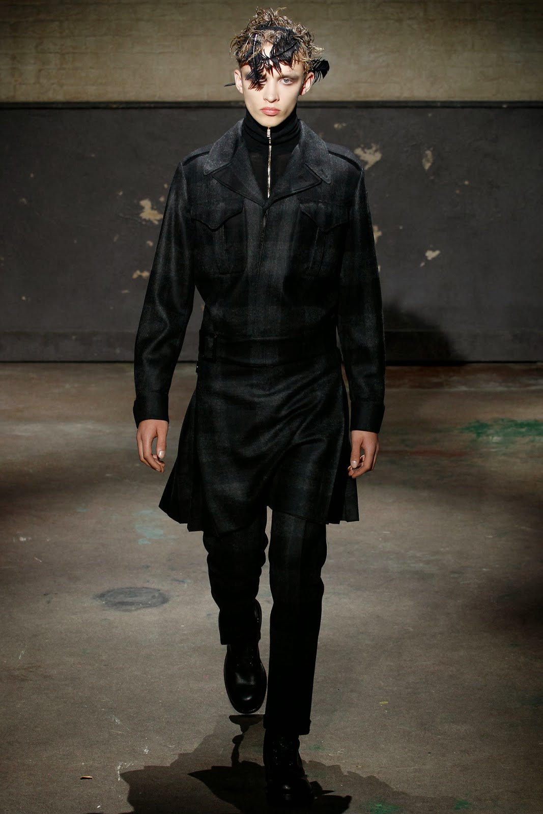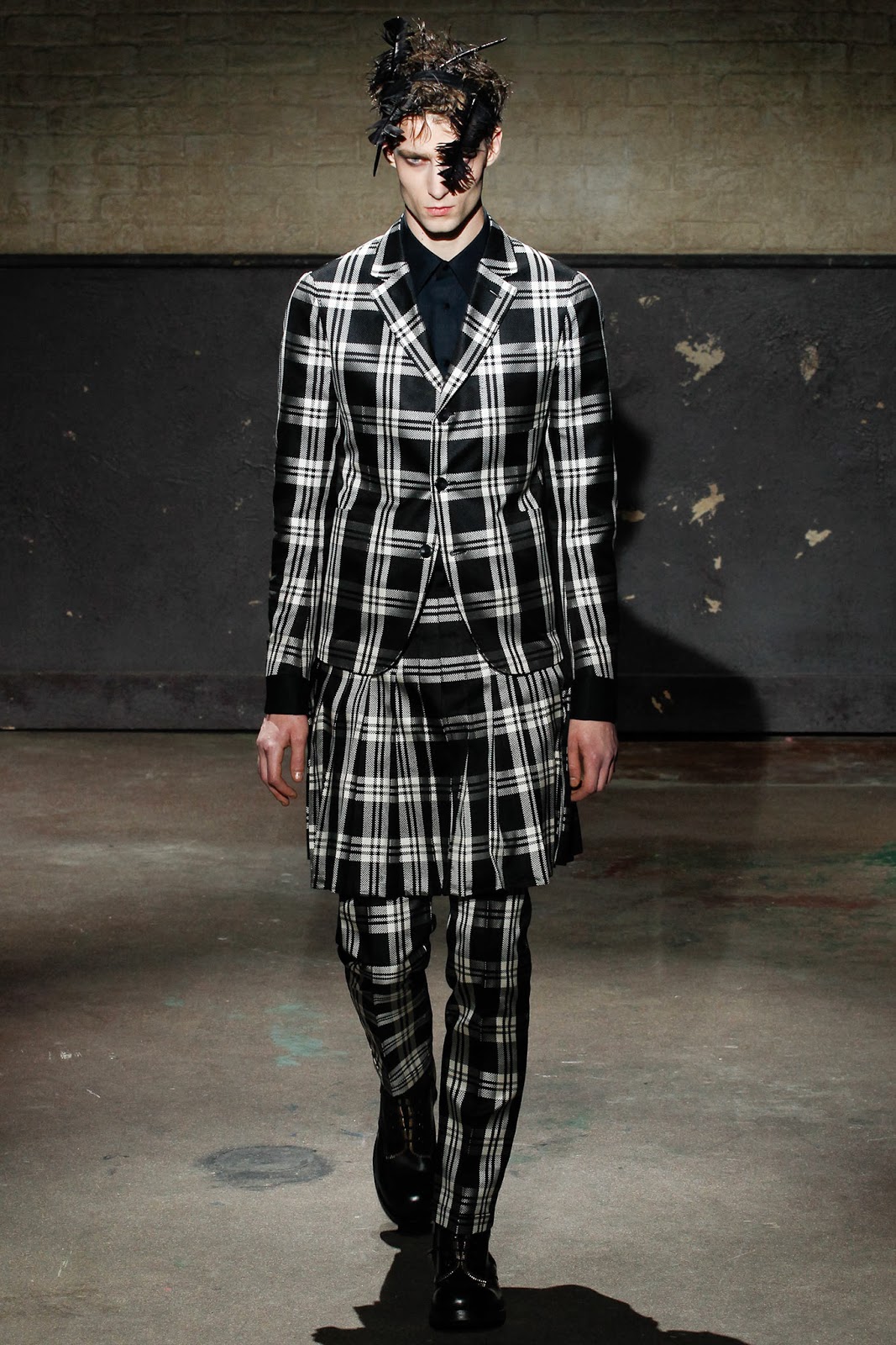 A marca Alexander McQueen mostra sua obscuridade característica em sua coleção de inverno 2014. Modelos esguios com penas pretas na cabeça e olhares profundos desfilavam as peças escuras e fechadas da grife, uma alfaiataria ajustada com grafismos de diversas proporções. A coleção inclui jaquetas, sobretudos e também saiotes – dando uma leve lembrança na androgenia. Ou estampa presente também que vale ressaltar, é o xadrez, que veio em uma alfaiataria costume – com direito ao saiote.