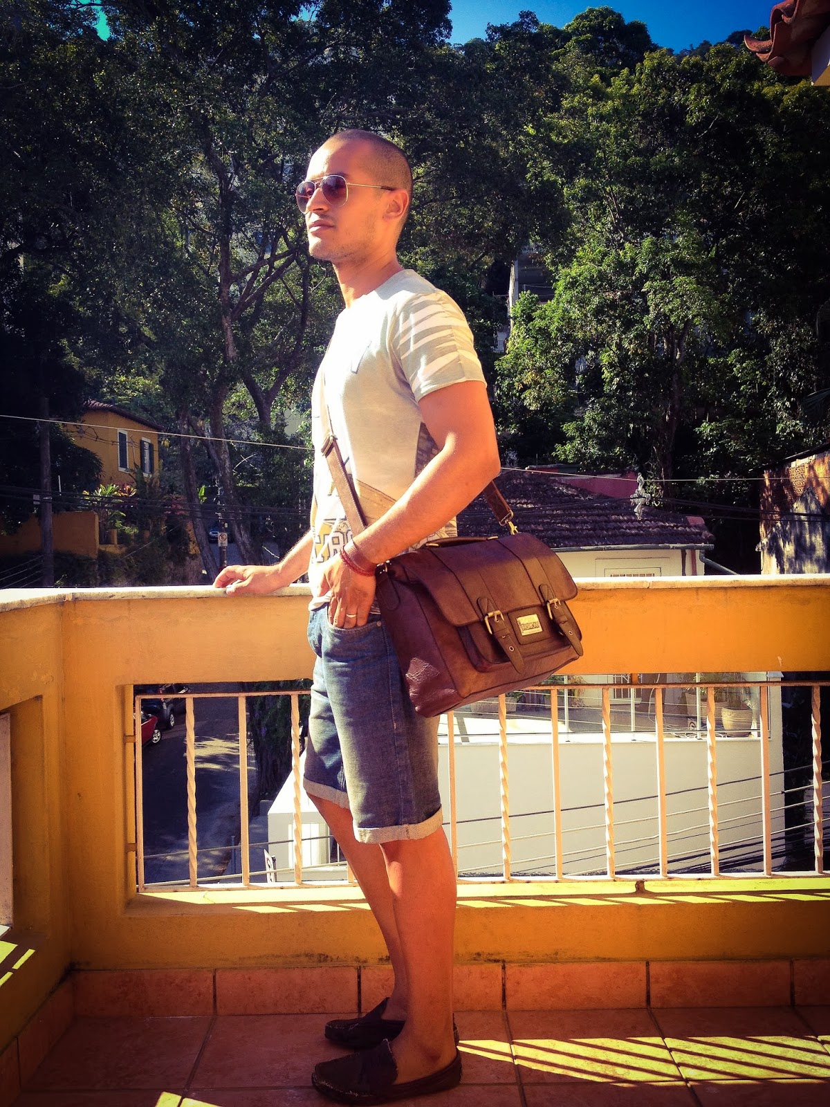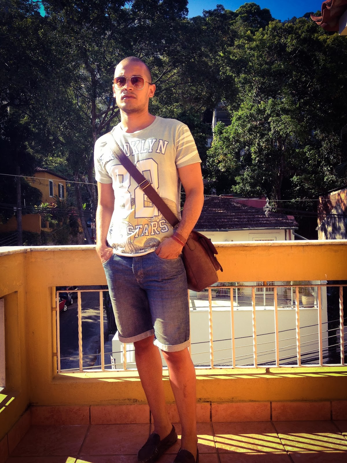 T-shirt: Riachuelo; Bermuda: Riachuelo; Sapatos: Zara; Bolsa: River Island; Óculos: Asos.