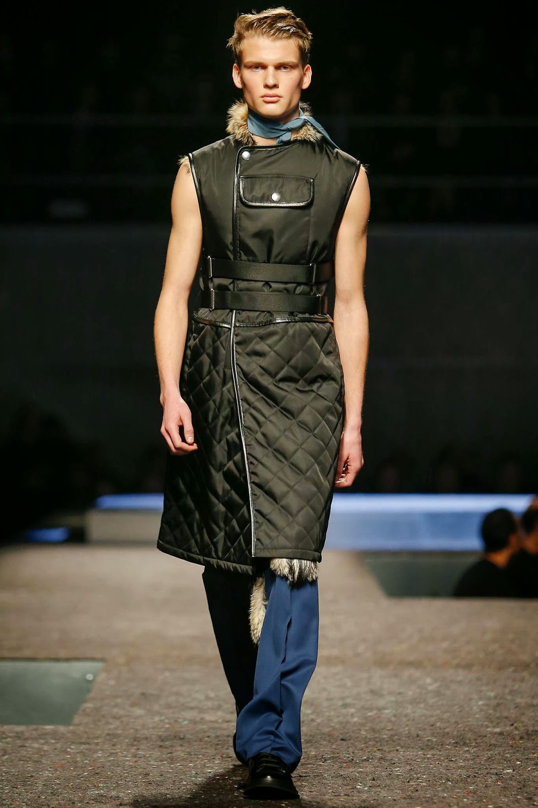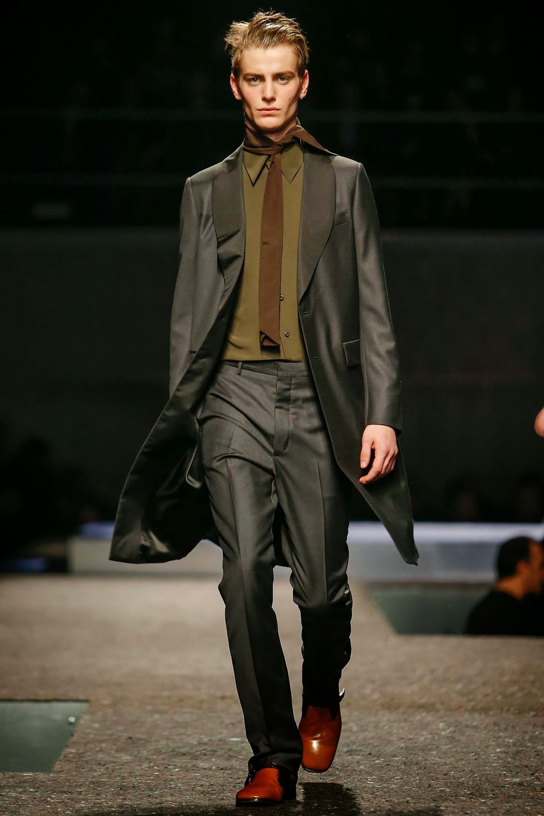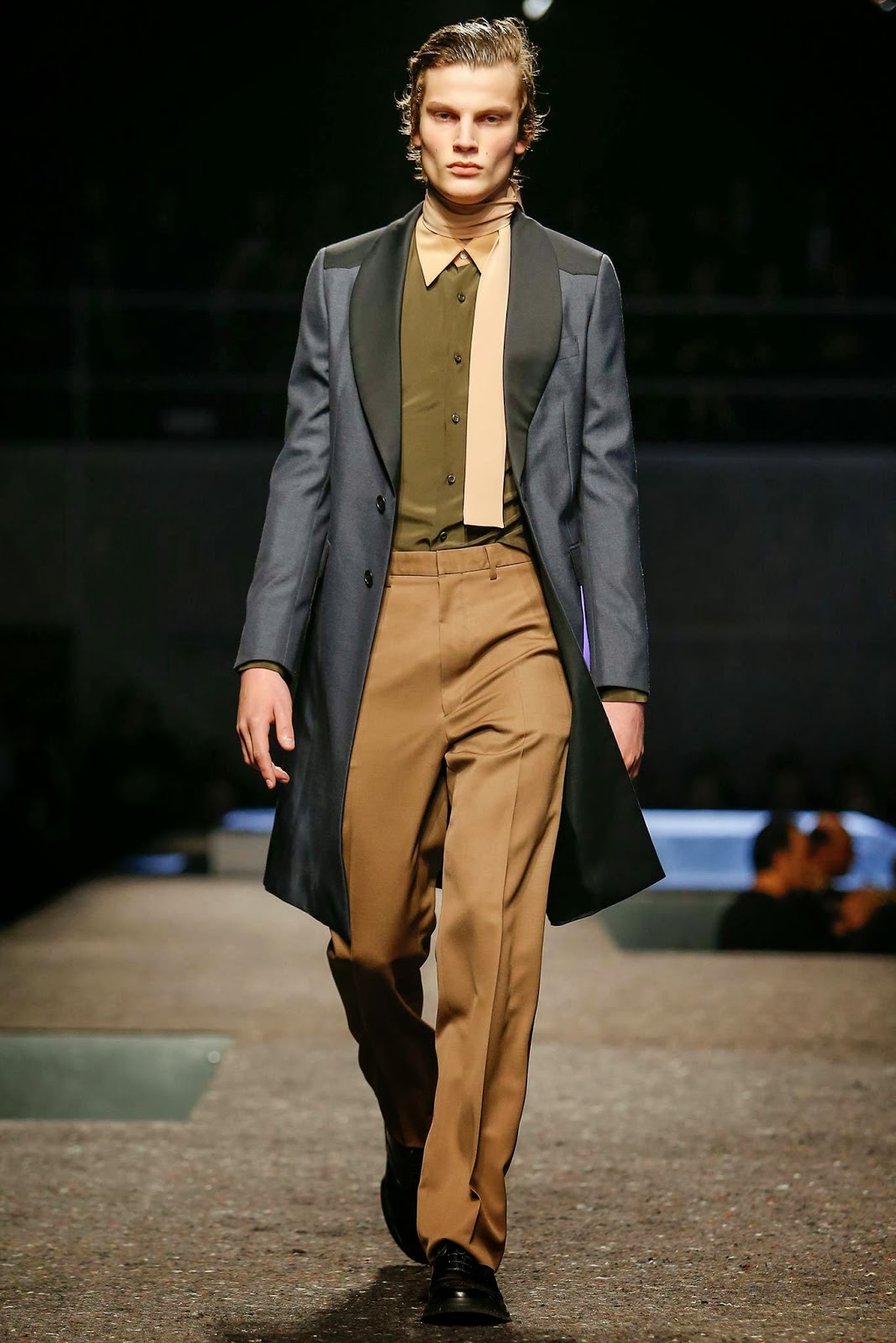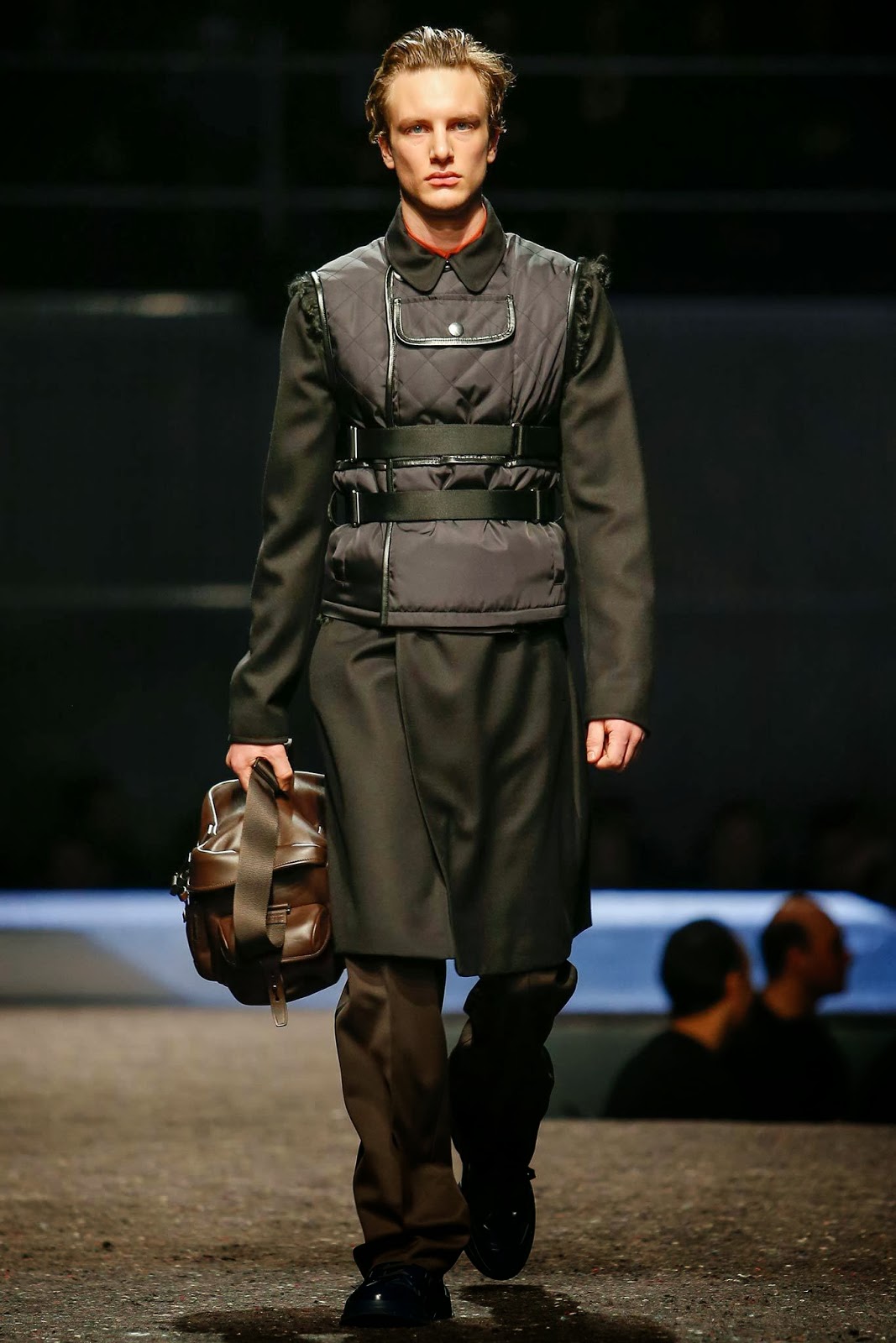 Trazendo peças com pegada militar e uma boa cartela de cores, a Prada mostrou sua coleção de outono/inverno 2014 na Semana de Moda Masculina de Milão. A casa italiana apresentou casacos longos e pesados para a temporada fria do ano; os detalhes da coleção ficam por conta dos coletes bomber com cortes, peles que saim das bordas dos casacos e também serviam como ornamentos, além de lenços retos e finos bem rente ao pescoço, que substituía elegantemente a gravata.