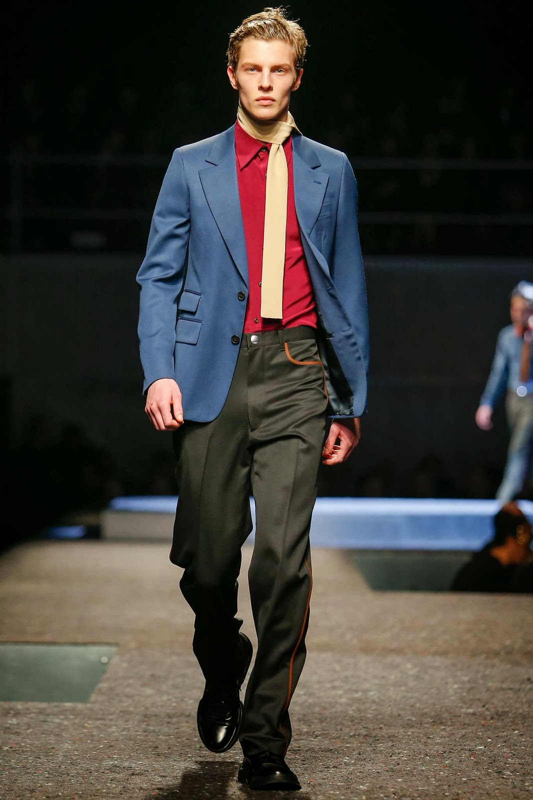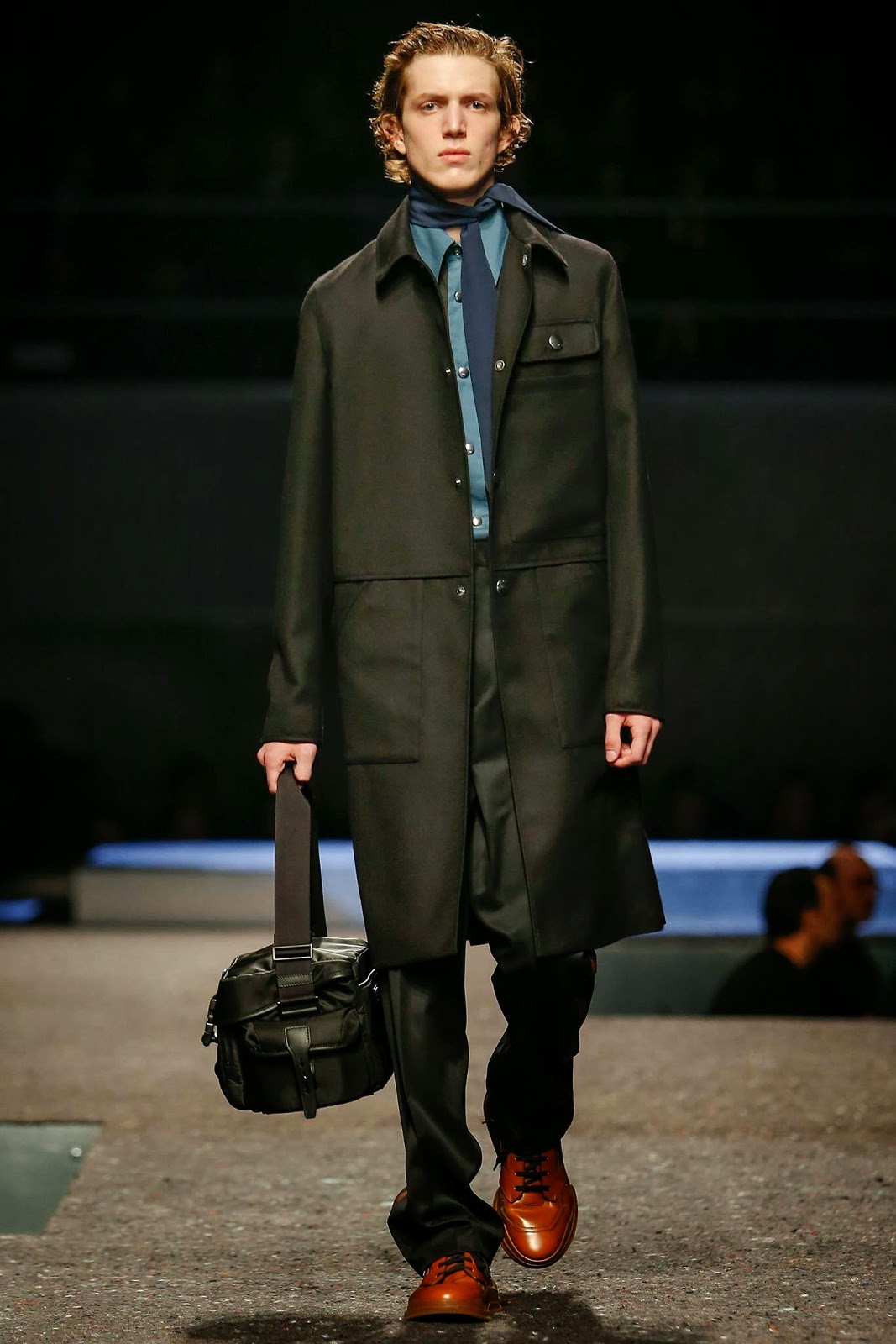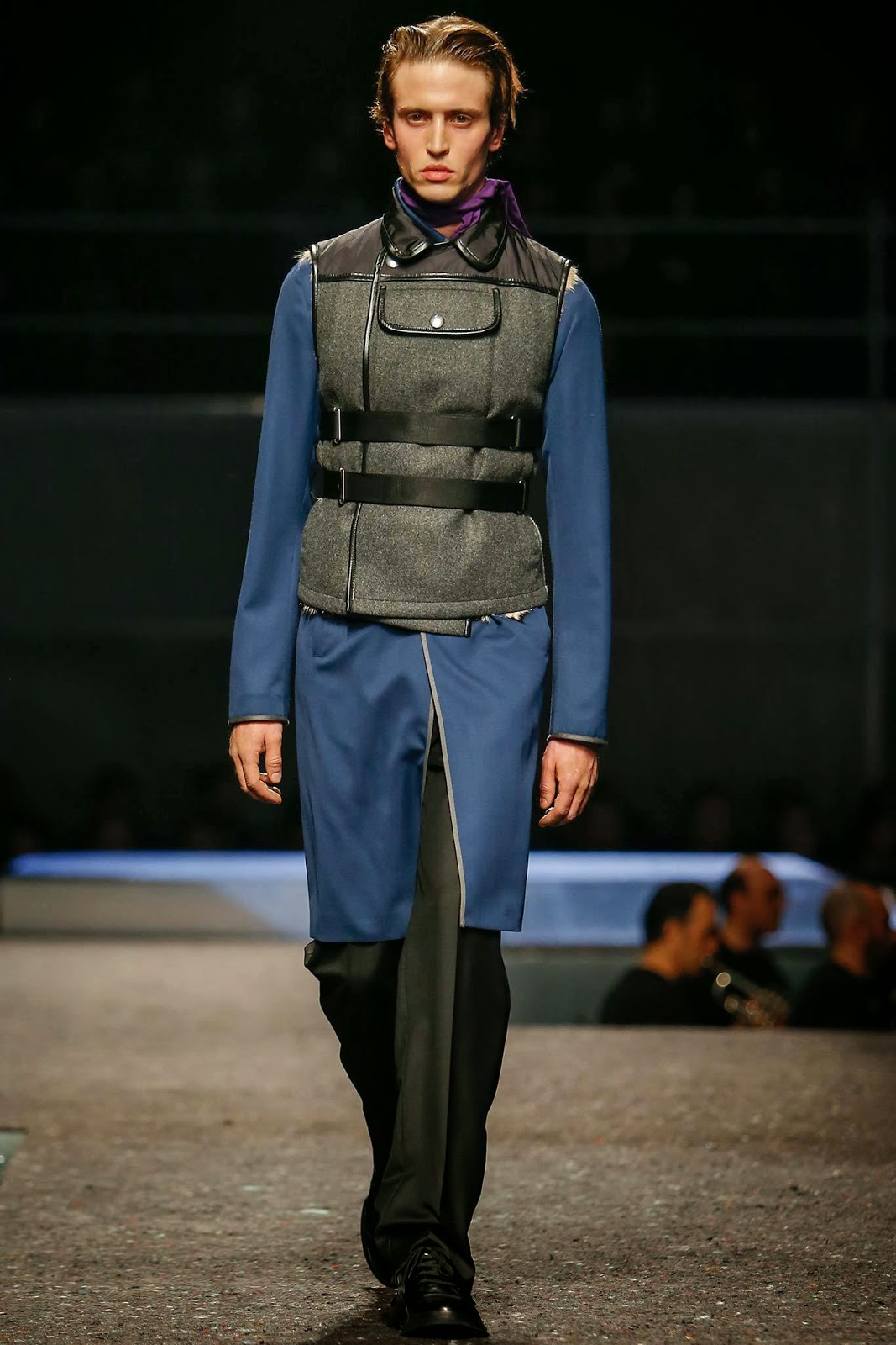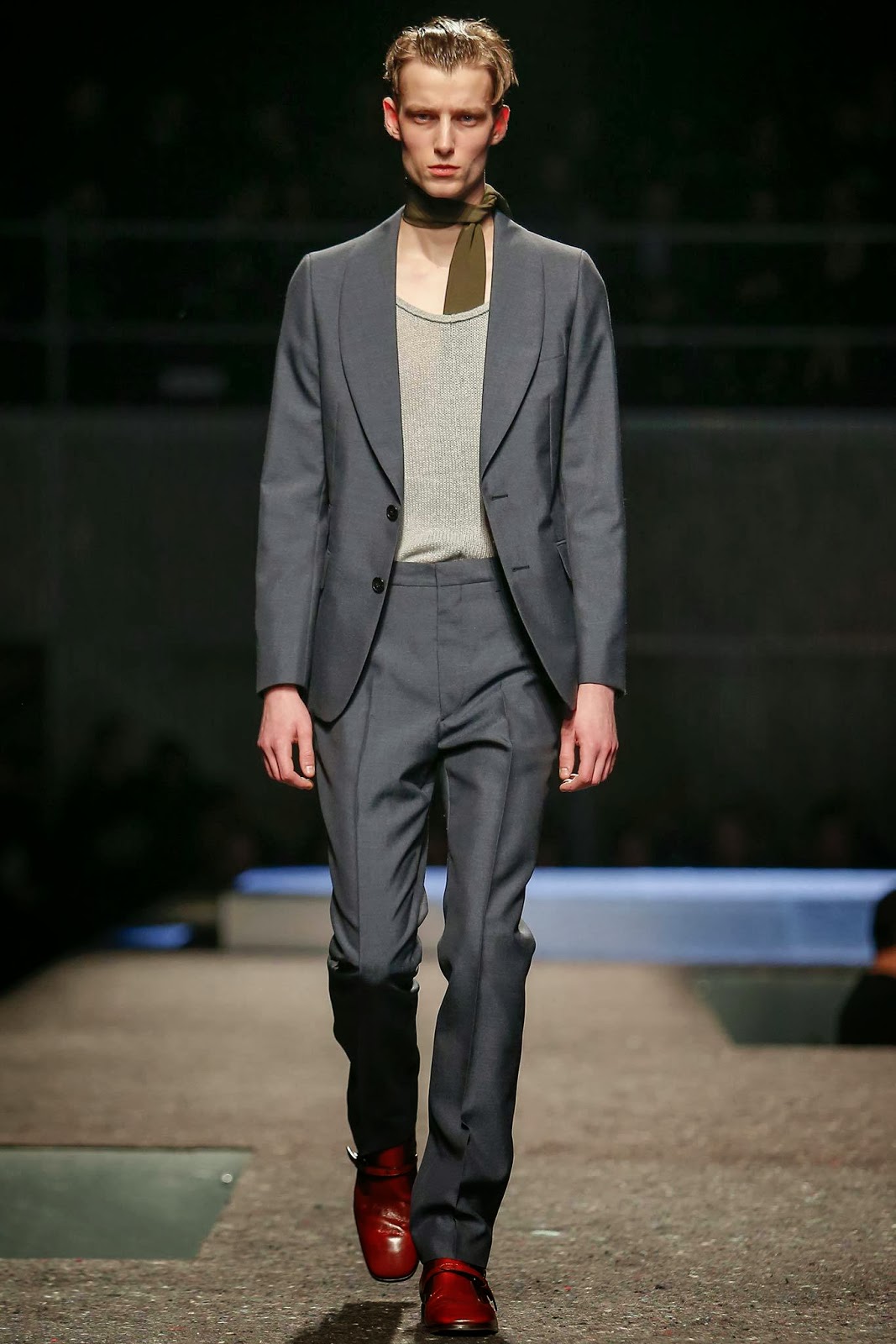 Trazendo peças com pegada militar e uma boa cartela de cores, a Prada mostrou sua coleção de outono/inverno 2014 na Semana de Moda Masculina de Milão. A casa italiana apresentou casacos longos e pesados para a temporada fria do ano; os detalhes da coleção ficam por conta dos coletes bomber com cortes, peles que saim das bordas dos casacos e também serviam como ornamentos, além de lenços retos e finos bem rente ao pescoço, que substituía elegantemente a gravata.