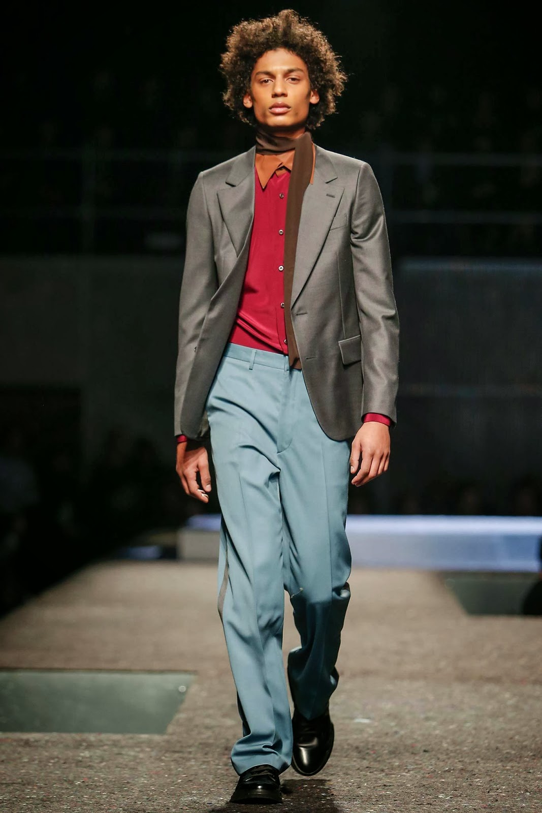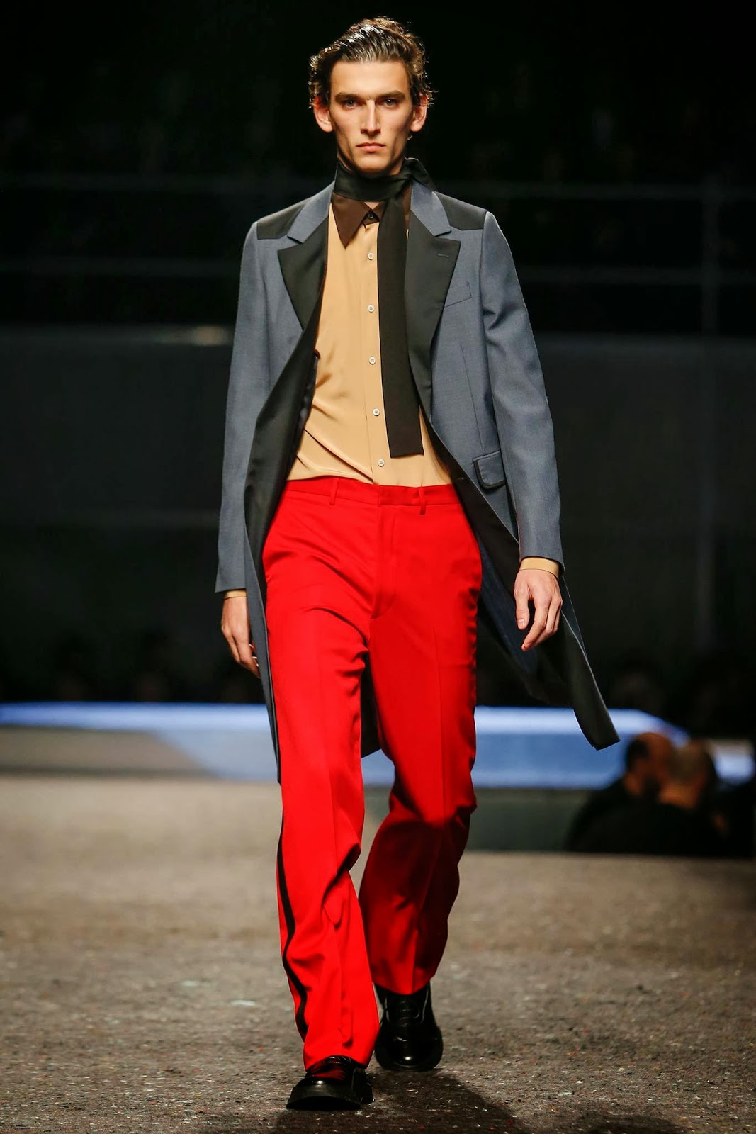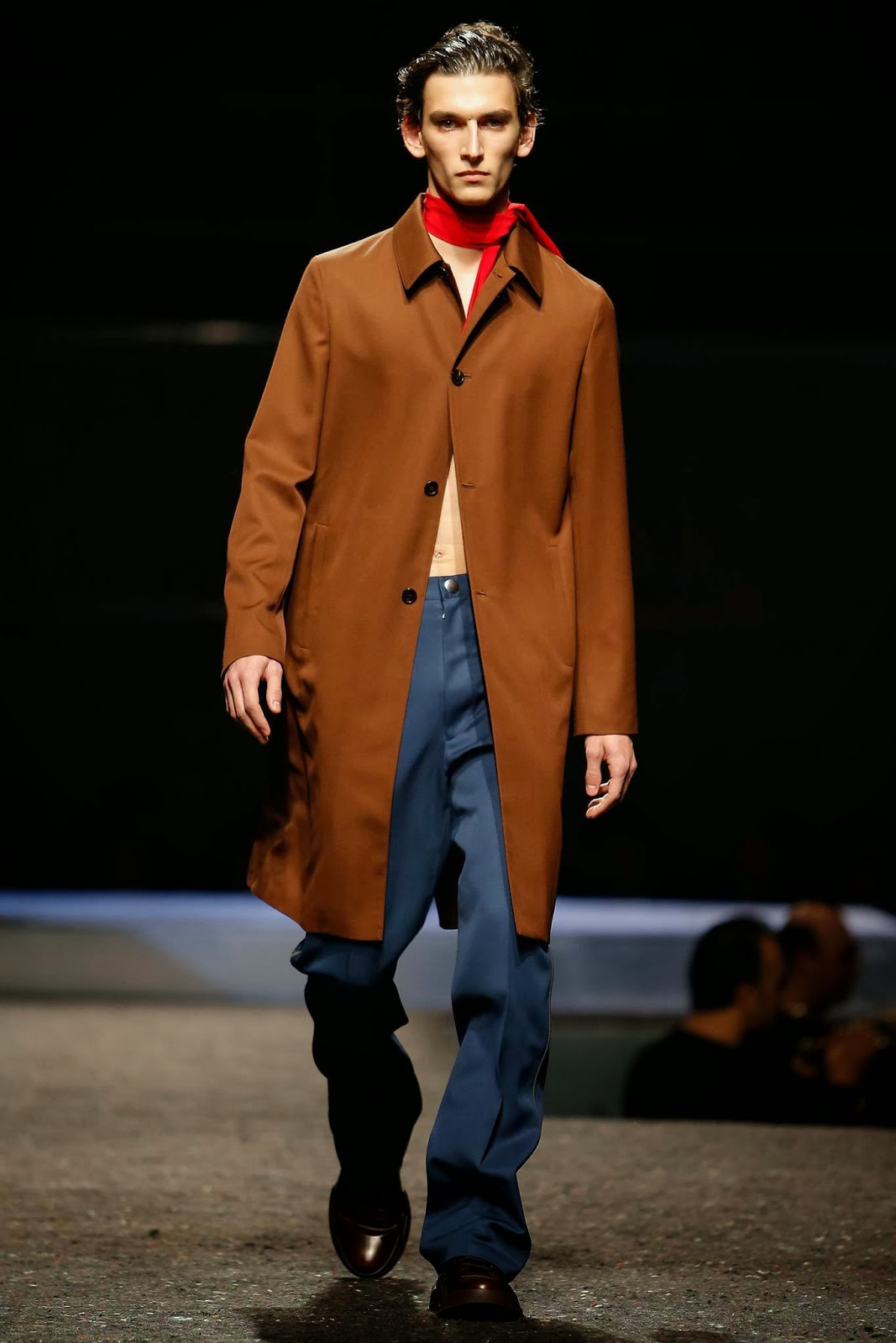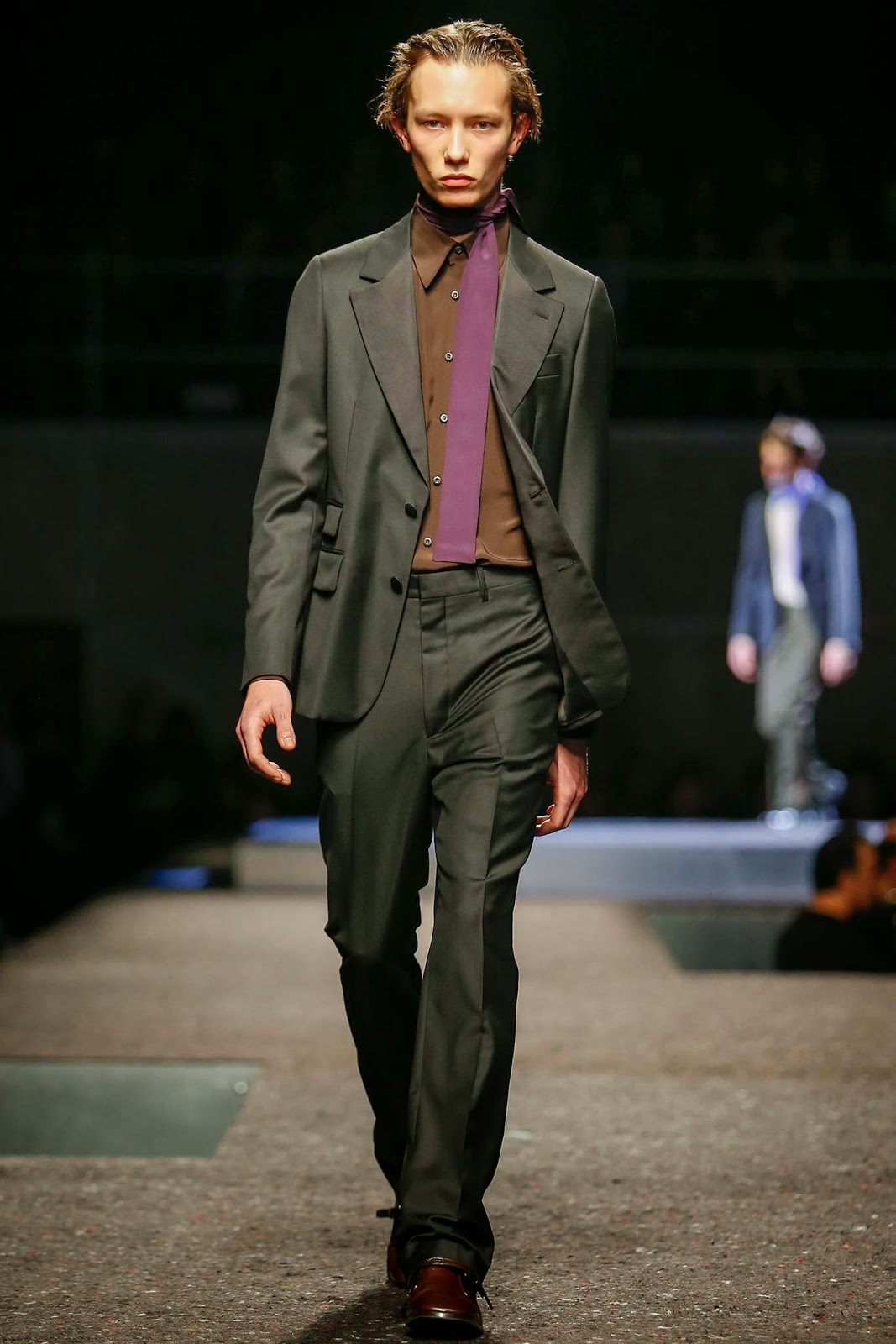 Trazendo peças com pegada militar e uma boa cartela de cores, a Prada mostrou sua coleção de outono/inverno 2014 na Semana de Moda Masculina de Milão. A casa italiana apresentou casacos longos e pesados para a temporada fria do ano; os detalhes da coleção ficam por conta dos coletes bomber com cortes, peles que saim das bordas dos casacos e também serviam como ornamentos, além de lenços retos e finos bem rente ao pescoço, que substituía elegantemente a gravata.