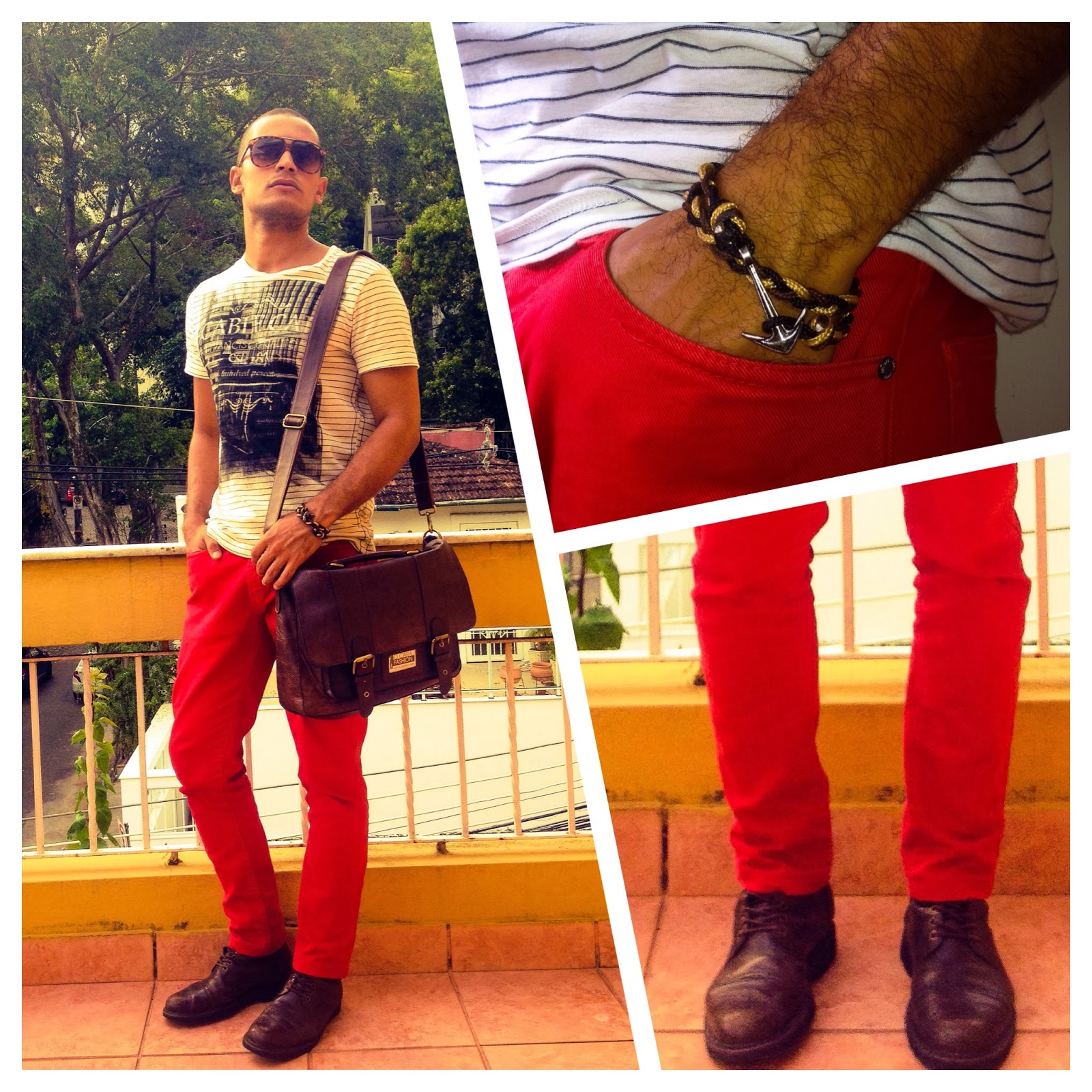 T-Shirt: Luidgi Specciale; Calça chino: Zara; Coturno: Riachuelo; Bolsa: River Island; Óculos: A. J. Morgan; Pulseira: Riachuelo.
