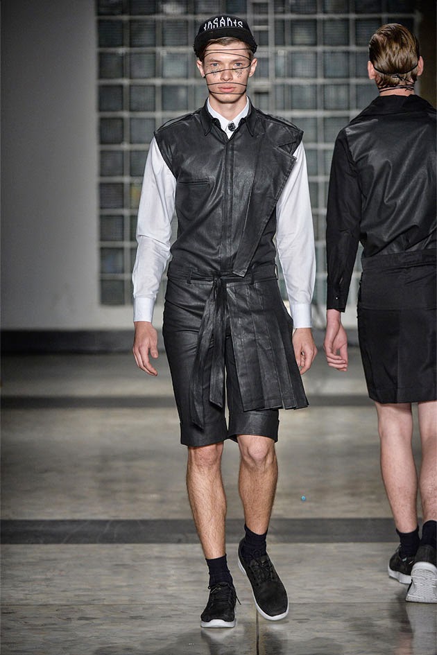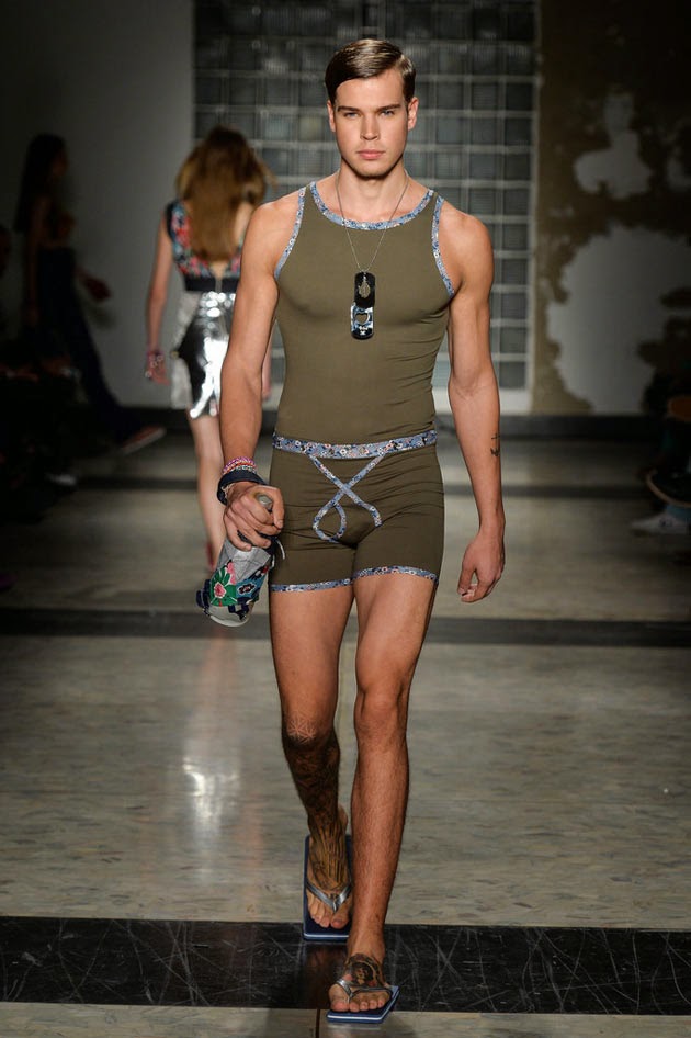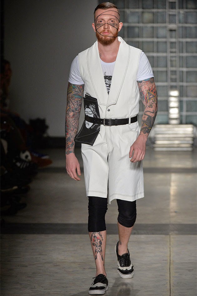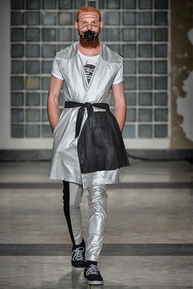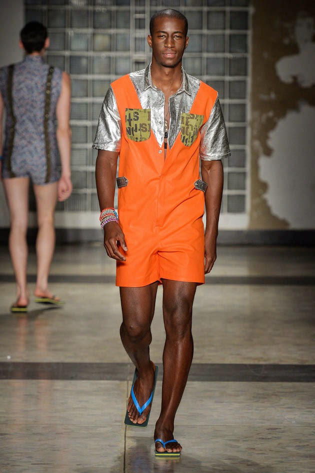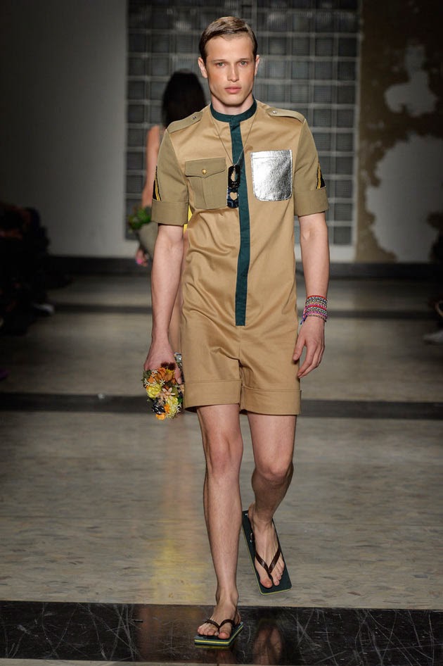 O estilista traz somente dois looks masculinos em seu desfile, mas que mostram a pegada usada por ele na sua inspiração, com um visual streetwear e pegada leve grunge. O interessante é ver que o macaca, peça por muitos esquecida, está sutilmente voltando ao guarda-roupas masculino.