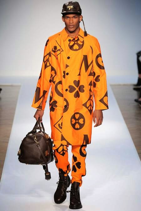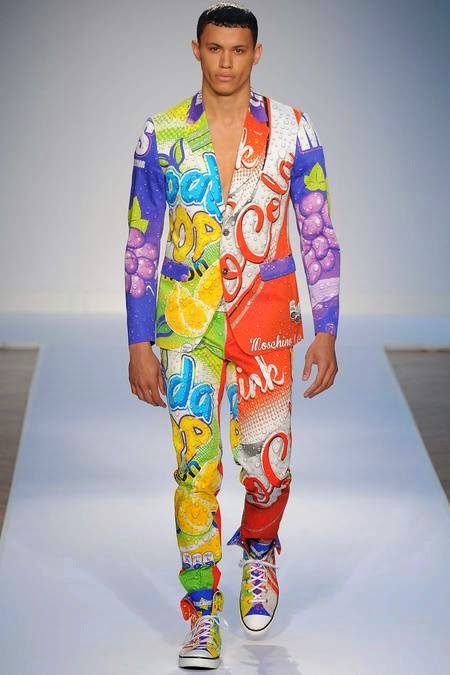 Em sua primeira coleção masculina para a Moschino, o gênio Jeremy Scott continua a mostra sua visão da pop art, com um desfile cheio de referências da nossa cultura contemporânea, com estampas coloridas de Coca-Cola, e também outras fazendo referências ao estilo street do hip-hop – seu grande público.