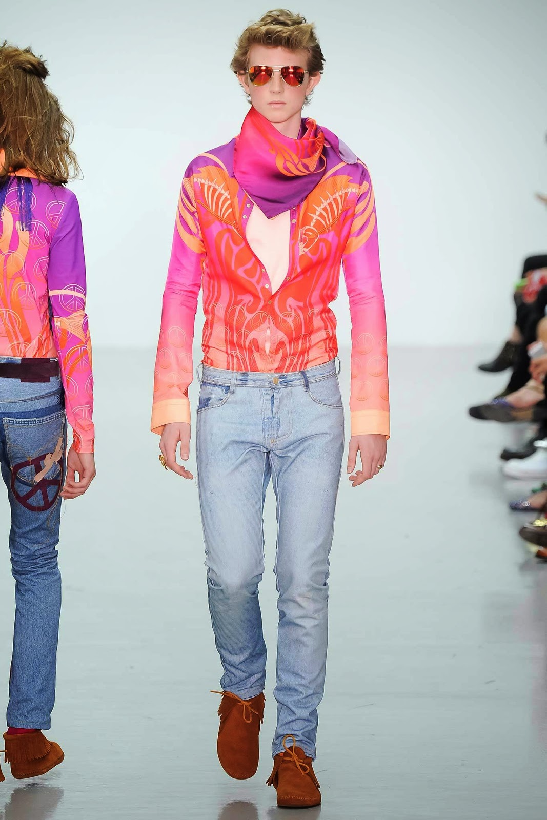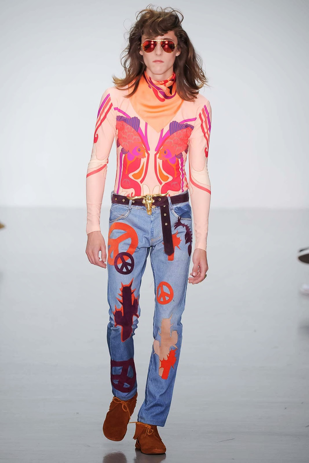 Com inspirações nos cowboys dos anos 1970 e a explosão do denim, a Katie Eary apresenta uma alegre coleção na semana de moda masculina de Londres. A marca traz a leveza e despreocupação da época em sua coleção, com referência nítidas e sucintas, como estampas do velho Oeste. O jeans vem representando sua popularização, que se firmou com grandes vaqueiros.