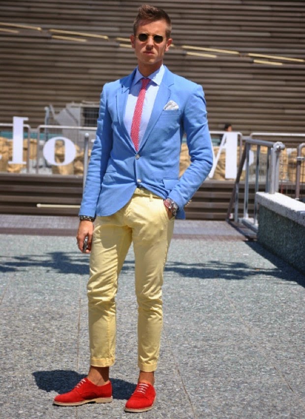 Esse tipo de roupa voltou ao cenário da moda masculina juntamente com o color blocking e o “novo preppy style”, adotado por muitos nos EUA e principalmente em países europeus, como França, Inglaterra e Itália. Se você trabalho em um ambiente forma, vai ser difícil chegar em seu escritório com um terno laranja e ser bem recebido, mas se seu ambiente e trabalho te dá a liberdade de brincar com as cores e sair do preto básico, qual é o mal nisso? Eu, Fabiano Gomes, sou bibliotecário, profissional que remete – erroneamente, claro – a um visual enfadonho, tenho liberdade no ambiente de trabalho de me vestir livremente – com bom senso, claro – canso de usar dois blazers coloridos que tenho, um azul bebê e outro goiaba. Das vezes que os uso no ambiente de trabalho, fui muito elogiado por homens e mulheres. Onde há mal nisso?