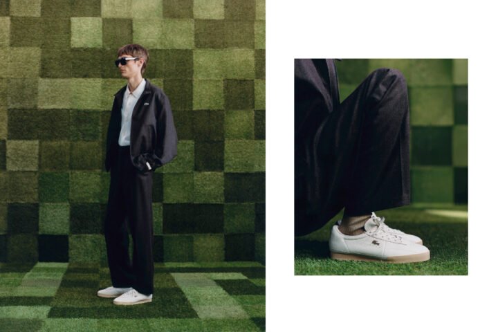 Lãs tropicais e mohair suntuoso combinados à nylons com tingimento especial e couro, enfatizam o conforto e a natureza sedutora dos momentos vividos em suspenso. Nesta temporada, o crocodilo é inspirado pelas quadras de tênis de grama traduzidas em bordados que celebram o savoir-faire francês enquanto honram a herança da marca, dando ao símbolo de assinatura da Lacoste uma expressão atual. A bolsa Lenglen também retorna nesta estação, com detalhes de acabamento inspirados em saias plissadas para tênis vintage e alças que remetem ao cabo das raquetes usadas na modalidade.