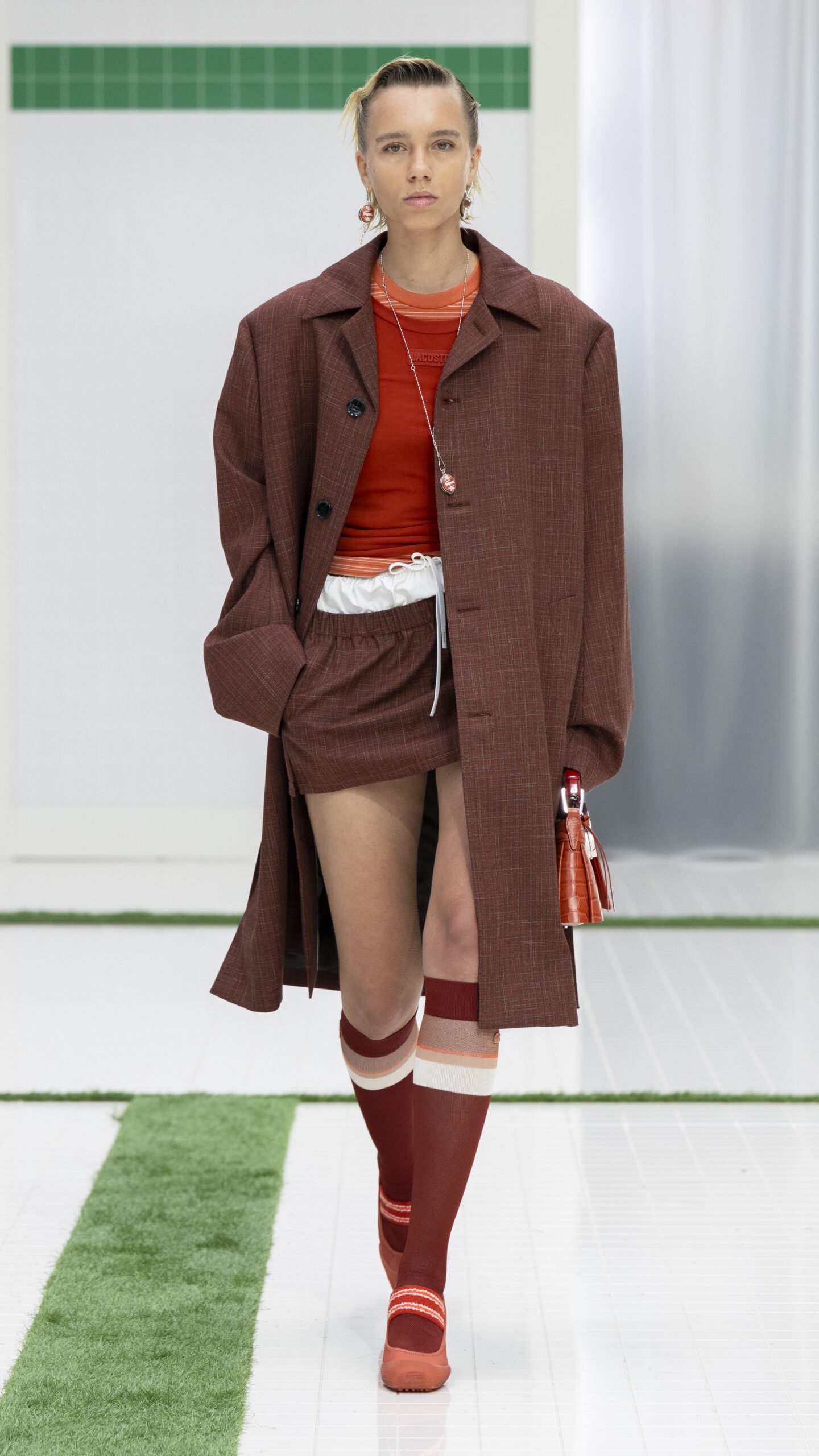 Enquanto o legado da Lacoste nos esportes serve de alicerce para as criações de Pelagia, a autenticidade crua evolui para contrastes refinados e frescos entre transparência e opacidade, conforto e fluidez, inspiração no esporte e elegância despretensiosa. Sensualidade, proporções inacabadas e herança esportiva combinadas ao sportswear vintage são a base para um armário elegante que não deixa de ser vibrante, com polos transparentes, peças marcantes em couro espelhado, trench coats que remetem à robes marcados com a frase “Tennis for Everyone” e peças ultraleves de nylon e seda tecnológica que contrastam, criando tensão, com itens utilitários de algodão emborrachado e de nylon de efeito molhado.