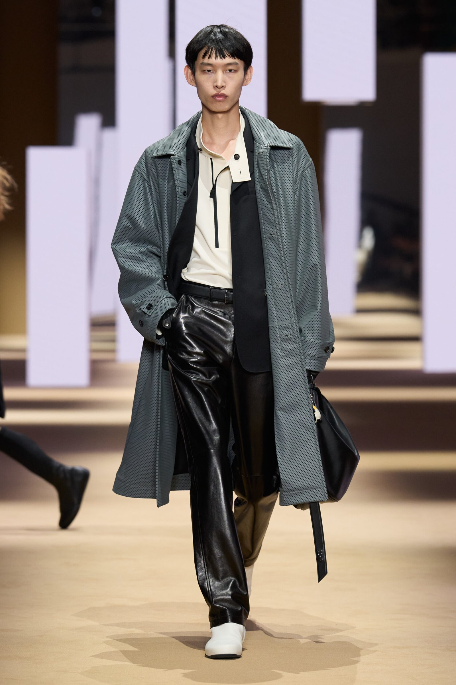 Os calçados tiveram papel central na narrativa da coleção. Modelos de corrida e ciclismo foram combinados à alfaiataria, propondo um guarda-roupa versátil para a vida urbana. A pesquisa de materiais também se destacou, com veludo tricotado à mão e nylon técnico com aparência de couro, evidenciando o cuidado da marca com acabamento e inovação têxtil. A cartela de cores explorou a base de azul e preto, com acentos em vermelho e azul elétrico.
